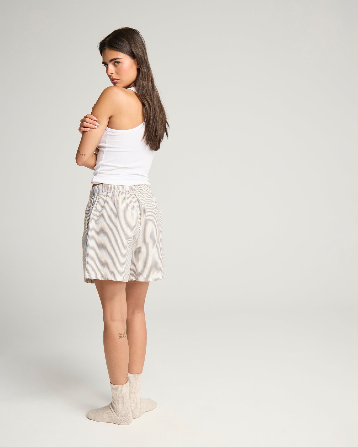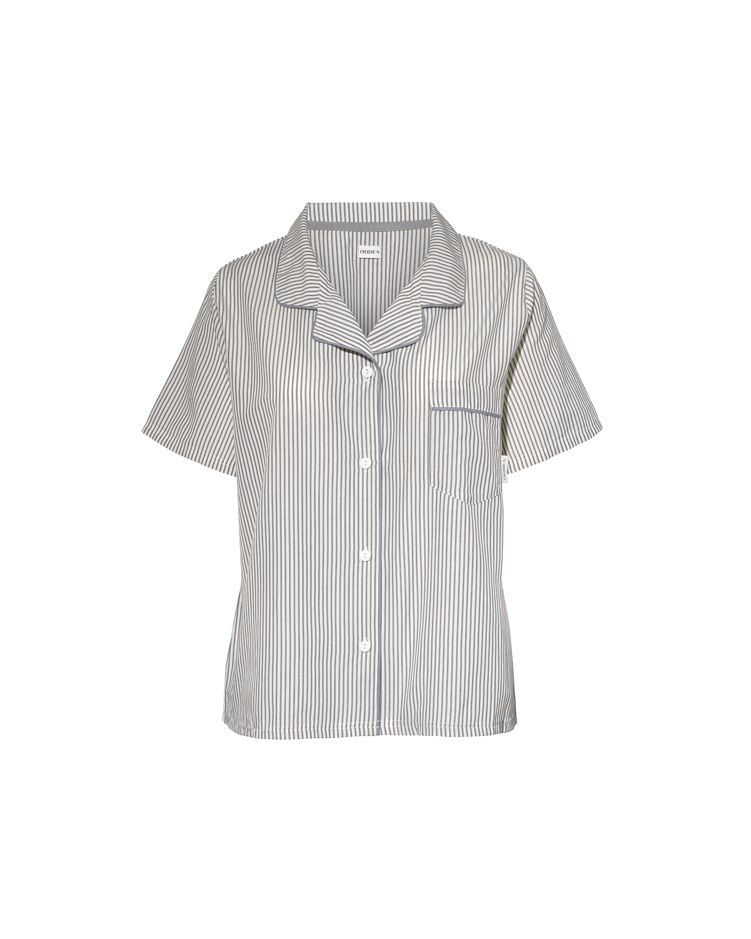 Short sleeve pyjama gift set. A masculine longline update on the classic boxer short, paired with a crisp short-sleeve shirt with boxy finish and timeless piping detail. A seasonal staple for relaxed dressing during the holidays and beyond.